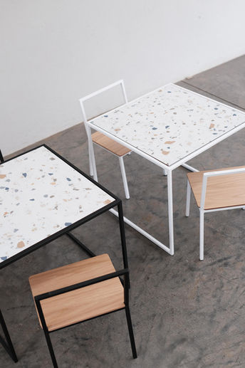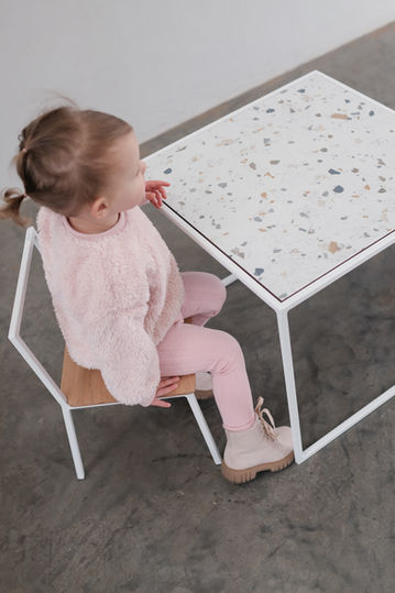 Our toddler table is made of a powder-coated steel frame and a floor tile as the top. Plus! You have options! You can choose between a black or white steel frame and there are two beautiful tile options for you to choose from for the top.